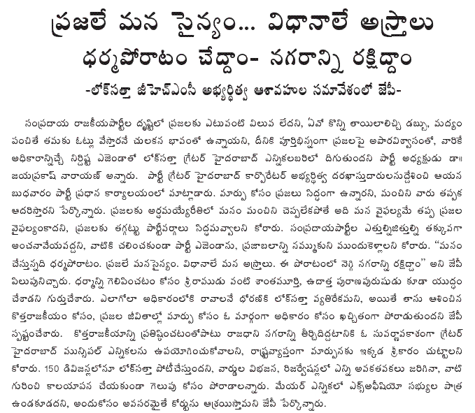 “Basic amenities have been neglected for years and even consumption of drinking water is posing a grave danger to people. People’s dignity, health and safety are undermined. Lakes are polluted with sewage, and public lands grabbed at will. The city is in peril and the Lok Satta s determined to safeguard the future. The two main slogans of the Lok Satta are, “Blow the whistle and save the city” and “Vote for Lok Satta and Power to people.”