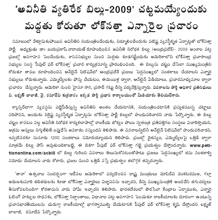 Dr. JP made it clear the party would go ahead with pursuing its agenda without bothering about alliances. “The task before the party is to convert people’s good will for it into votes. There has already been a perceptible change in people’s stand towards the party but it takes time for it to become prominent. Beginning with a victory in the GHMC elections, the party will spread new politics to the entire State.”