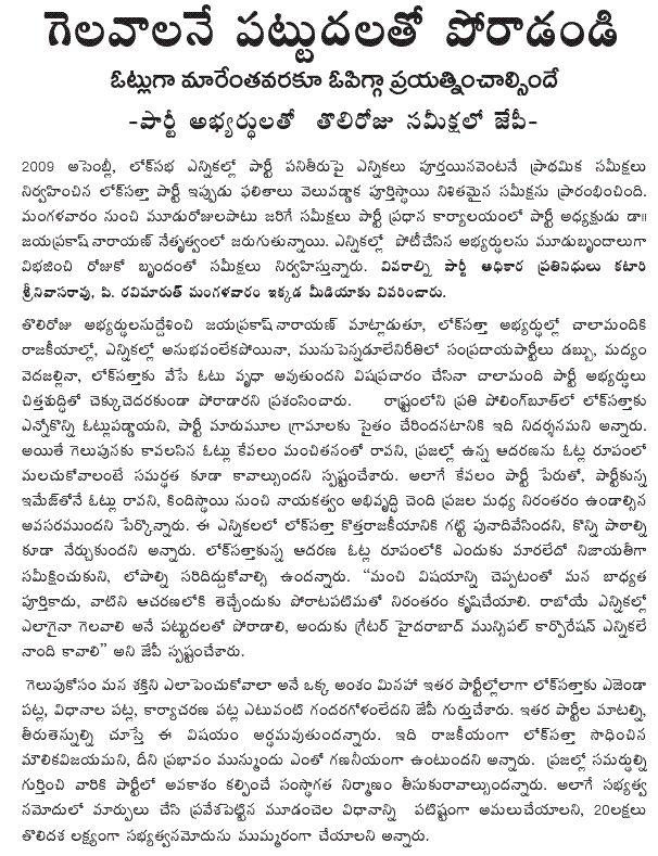 Addressing a meeting of party people who contested the 2009 elections, Dr. JP recalled that although most of them were new to politics and elections they had put up a creditable performance in the face of the traditional parties’ bid to induce voters with money and liquor and the vicious propaganda that a vote to the Lok Satta would be a wasted vote. “But you don’t win an election simply by being good and sincere. You have to live amidst people, fight for their causes and provide competent leadership to convert their good will into votes.”