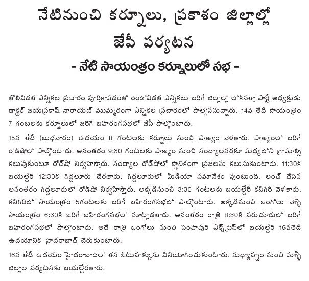 Lok Satta Party President Dr. Jayaprakash Narayan will be visiting Nandyal in Kurnool district and Giddalur, Kanigiri, Ongole, Parchur and Chirala in Prakasam district tomorrow (Wednesday, April 15) to campaign for party candidates contesting the Assembly and the Lok Sabha elections. He is scheduled to address a public meeting at Kanigiri at 11-30 a.m. and at Parchur at 5-00 p.m.