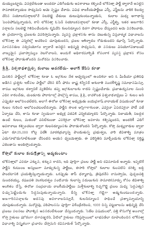 The Lok Satta Party’s Election Campaign Committee members told the media that a separate State could always be carved out if the people wished it, by following the procedure prescribed in the Constitution. When more than 80 countries in the world are less in area than a district in Andhra Pradesh, formation of a Telangana State is not a big deal.