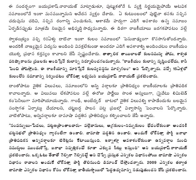 “The new politics that the Lok Satta is promoting has three critical planks – opportunities to all without discrimination on grounds of caste, family and birth; clean and honest politics as a moral endeavor; and fair representation for all.”