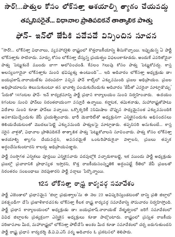 “Against such a backdrop, the Lok Satta is not averse to entering into electoral alliances with parties and forces, which are prepared to embrace certain non-negotiable fundamentals. They have to pledge themselves against inducing voters with money and liquor and fielding candidates with criminal background. They should agree to treat citizens with dignity and respect and not as beggars. An agreed common agenda based on education, healthcare, skills for youth and job promotion, rejuvenation of agriculture and traditional occupations, social security to one crore poor families to give dignity to the unorganized workers, district governments, rural infrastructure, citizen empowerment and uncompromising fight against corruption should form the bedrock of any principled political alliance.