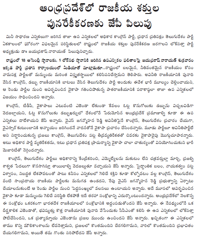 ఆంధ్రప్రదేశ్ లో రాజకీయ శక్తుల పునరేకీకరణకు జేపీ పిలుపు