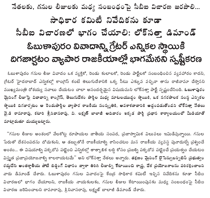 CBI should inquire into nexus between politicians And mining leases: Lok Satta (Telugu)