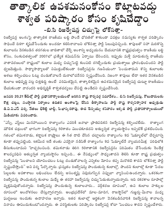 Lok Satta opposes reservations Beyond 50 percent (Telugu)