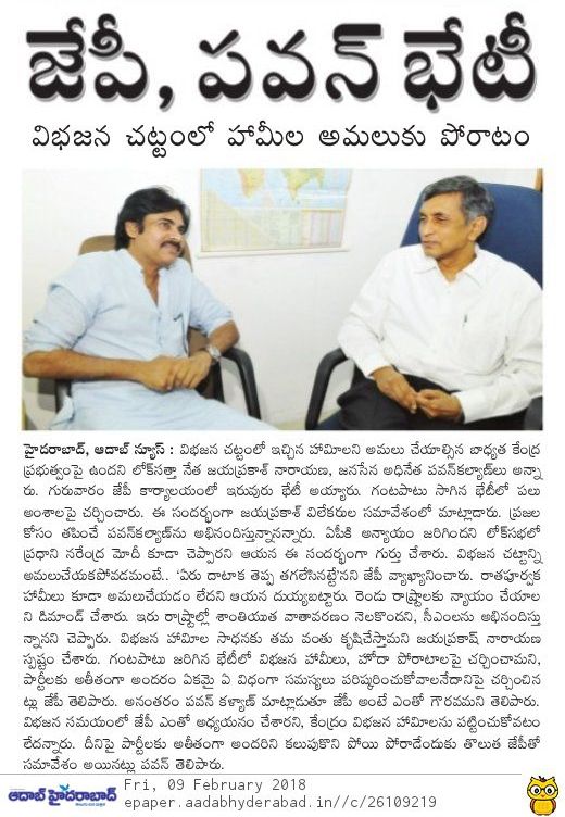 Hyderabad: Jana Sena founder Pawan Kalyan called on Lok Satta founder Jayaprakash Narayan here on Thursday to discuss the promises made in Parliament at the time of bifurcation of Andhra Pradesh and the status of their implementation.