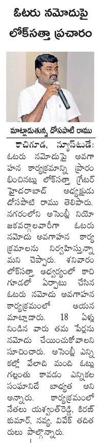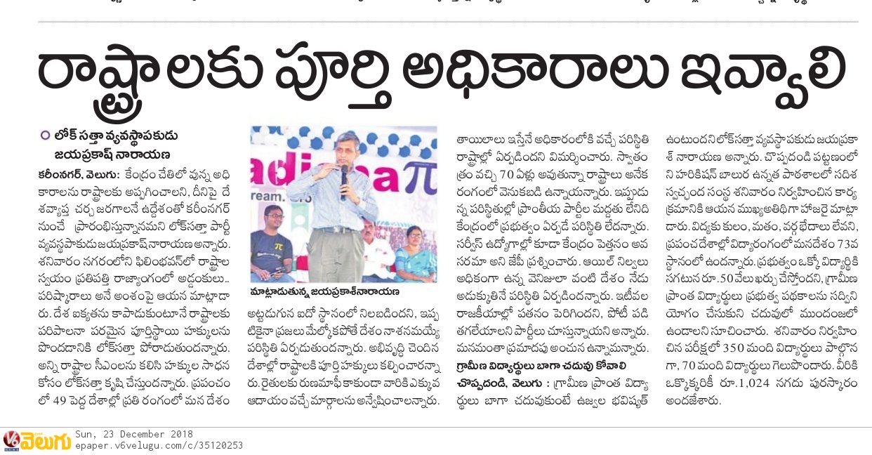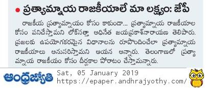 చట్టసభల్లో ప్రాతినిథ్యం లేకున్నా మా పోరాటం ఆగదు - లోక్ సత్తా వ్యవస్థాపకుడు జేపీ Monday, January 7, 2019 - 22:30