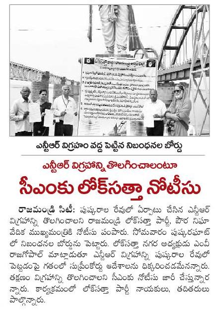 ఎన్టీఆర్ విగ్రహాన్ని తొలగించాలంటూ సీఎంకు లోక్ సత్తా నోటీసు