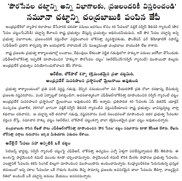 'పౌరసేవల చట్టాన్ని అన్ని విభాగాలకు, ప్రజలందరికీ విస్తరించండి' నమూనా చట్టాన్ని చంద్రబాబుకి పంపిన జేపీ