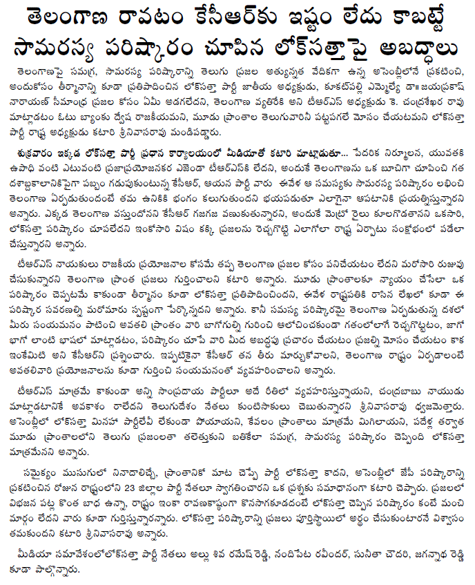 Mr. Srinivasa Rao was rebutting the allegation of TRS President K. Chandrasekhara Rao that the anti-Telangana Dr. JP had not sought anything for Seemandhra people. Anticipating a threat to its very existence, the TRS seems to be stalling Telangana formation under one pretext or the other. Spewing venom on Dr. JP and fuelling hatred among people seem to be part of its tactics.