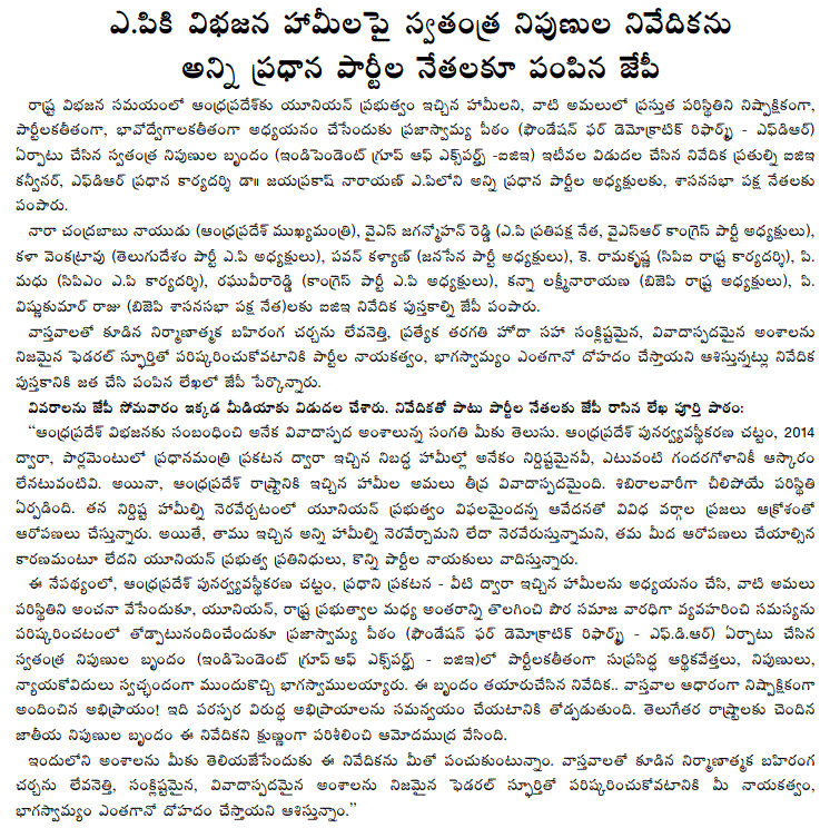 ఏ.పి.కి విభజన హామీలపై స్వతంత్ర నిపుణుల నివేదికను అన్ని ప్రధాన పార్టీల నేతలకూ పంపిన జేపీ Monday, January 21, 2019 - 17:33