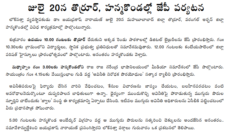 ఎన్నికల నేపథ్యంలో లోక్ సత్తా పార్టీ బలోపేతానికి ఏపీ, తెలంగాణల్లో కమిటీల్ని ప్రకటించిన జేపీ Wednesday, August 22, 2018 - 17:29