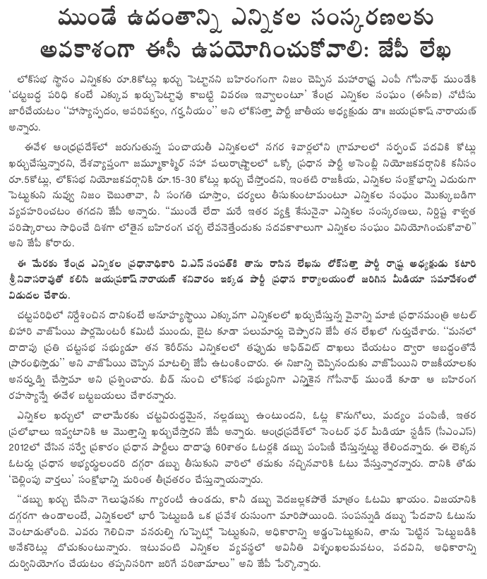 An overwhelming majority of the legislators across the country are routinely and openly spending enormous amounts that far exceed the prescribed limit - by twenty to thirty times in most cases, as a part of their electoral expenditure. In many states, Andhra Pradesh for instance, an expenditure of Rs. 5 crore is quite commonly incurred by candidates of each major party for the Assembly seat; it goes up to as high as Rs. 25-30 crore for a Lok Sabha seat. The well-reported testimony of the Former Prime Minister Atal Bihari Vajpayee before a parliamentary committee that “every legislator starts his career with the lie of the false election return he files” confirms the scale and magnitude of this grave democratic distortion. Today, the Lok Sabha MP from Beed has merely and openly acknowledged what has been public knowledge, all along.