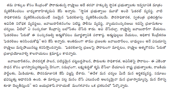 Addressing the newly elected members of the party's State Council, Dr. JP said that although the Lok Satta is just a few years old and has few resources it has set an example to all other parties in the country by holding organizational elections by secret ballot. He expressed heart-felt thanks to the Independent Election Authority, headed by former Chief Election Commissioner K. Madhava Rao for conducting the elections in an impartial manner.