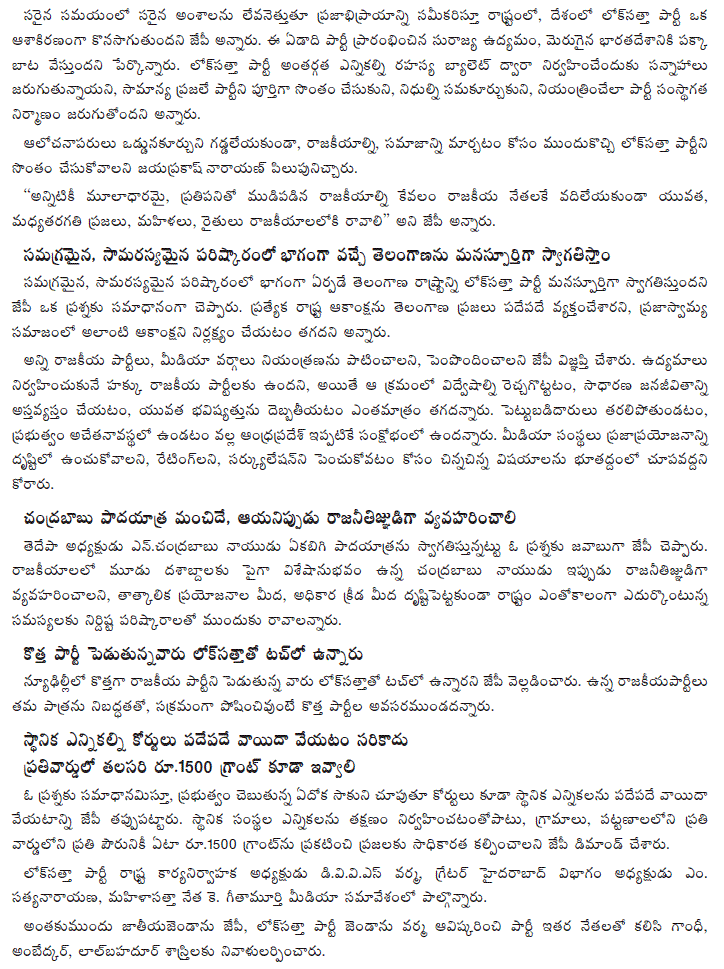In reply to a question, Dr. JP said that the Lok Satta Party whole-heartedly welcomes the formation of Telangana as part of a comprehensive and amicable solution. The Telangana people have repeatedly expressed their aspiration for a separate State and it cannot be ignored in a democratic society.