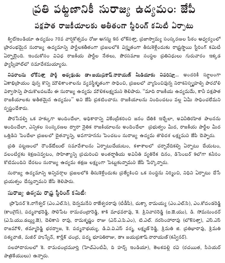 The following are members of the Surajya Steering Committee: Messrs Prof. K Nageshwar (MLC), Chennamaneni Rajeshwara Rao (TDP), Chukka Ramaiah (MLC), M. Kodanda Reddy (Congress), Padmanabha Reddy, Solipeta Ramachandra Reddy, Kaki Madhava Rao, K Srinivasa Reddy (IJU), D. Somasundar (APUWJ), Chelikani Rao, Ramakrishnam Raju (NAPM), TL Narasimha Rao (Lok Satta), S. S. Rajamouli, Tammareddy Bharadwaja, K Padmanabhaiah, D. V. V. S. Varma, Lakshman Reddy, Mrs. G Pratibha Rao, Mrs. Satyavaani, Mazer Hussain, Karthik Chandra, Ms Padma Bhupati Raju and Dr Jayaprakash Narayan (Convenor).