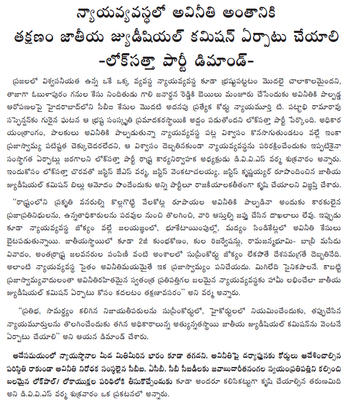 Mr. Varma said that there have been no instances in Andhra Pradesh of elected people's representatives and bureaucrats who indulged in massive corruption by squandering away finite natural resources being sacked and jailed and their ill-gotten wealth being confiscated. It is only because of judicial intervention scams in Jalaygnam, land allotment and liquor distribution have come to light. Even at the national level, it is the Supreme Court's intervention in issues like the 2-G scam, caste reservations, Rama Janmabhoomi-Babri Masjid dispute and inter-State water issues that has preserved the country's integrity. If even the judiciary becomes corrupt against such a backdrop, democracy ceases to work and paves way for military rule. Therefore, Mr. Varma said, all democrats should strive for the constitution of a National Judicial Commission to ensure an independent and strong judiciary.