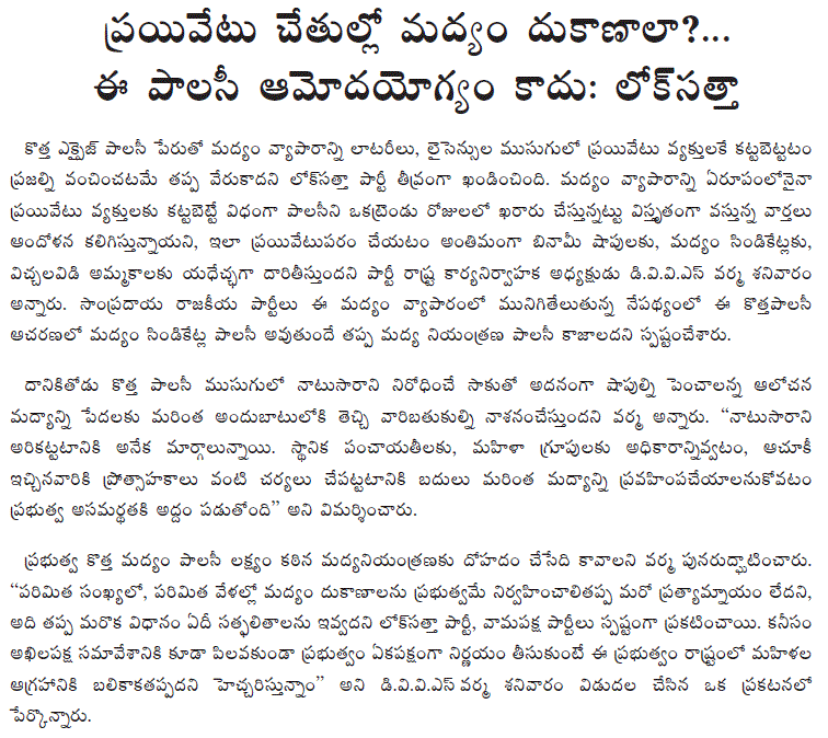 In a media statement, Lok Satta Party Working President D. V. V. S. Varma said the policy would once again spawn liquor syndicates along with benami bidders and lead to unbridled liquor sales.
