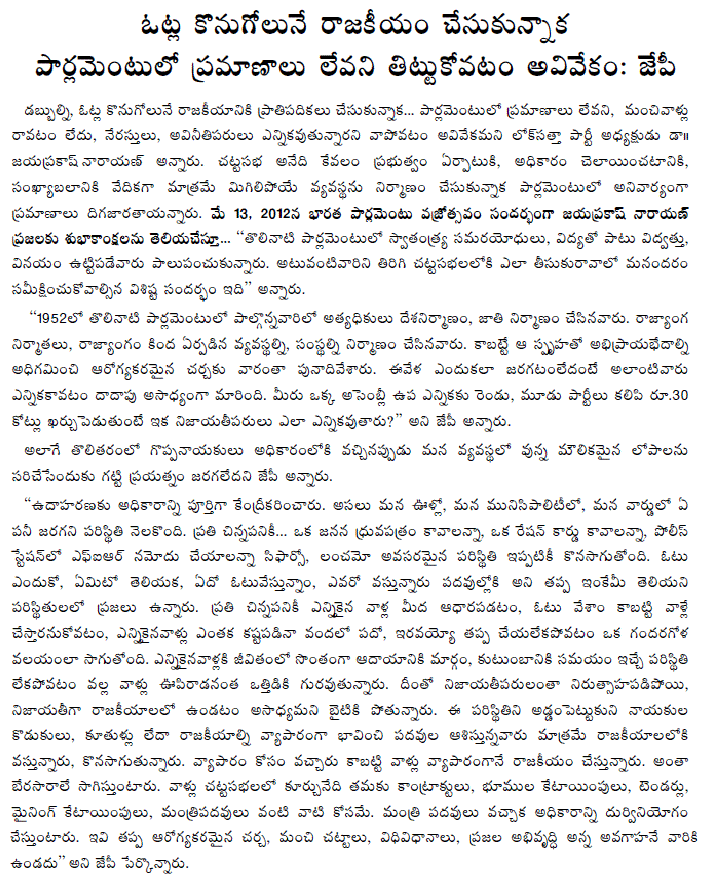 Greeting people on the diamond jubilee of Parliament, Dr. JP said in a media statement that people should ponder over means of electing educated, erudite and humble representatives to legislatures. The first Parliament of 1952 contributed to healthy discussions because it included a large number of people who fought for freedom, nation building, and formation of constitutional bodies. How could people of integrity get elected to the legislature these days when two or three parties spend a total of about Rs.30 crore for a by-election to the Assembly, asked Dr. JP.
