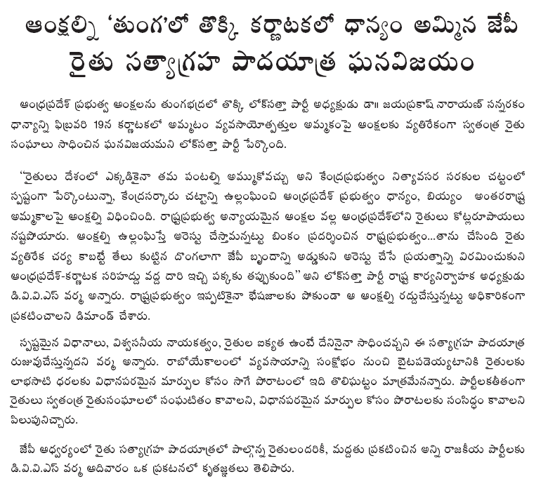 The farmers will set off from Pocharam village at 9-00 a.m. on February 25 and reach Bodhan for the night touching Yellareddy and Banswada en route. They will resume their journey from Bodhan at 9-00 a.m. on February 26, cross the border check-post at Saluru and undertake sale of paddy through auction at Esgi village in Nanded district. Dr. JP will be addressing and interacting with farmers during the satyagraha movement.