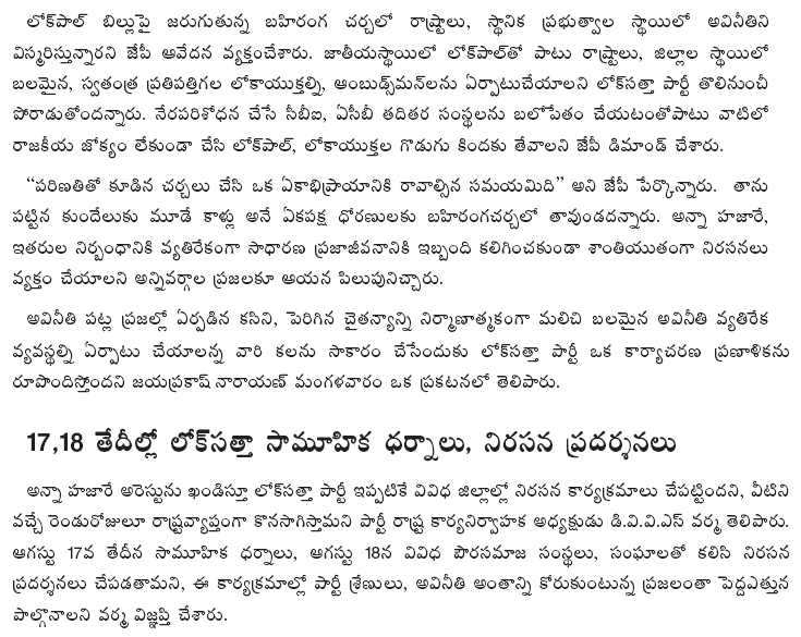 In a media statement, Dr.JP said there could be honest and legitimate differences of opinion and approach to the creation of Lokpal, Lokayukta, and ombudsmen institutions between the Government and civil society. Some of the demands of the civil society on the Lokpal institution may be far-fetched.