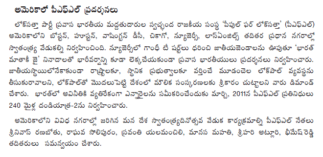 Messrs Srinivas Ranabothu, Raghava Solipuram, Sravanthi Yelamanchili, Manasa Mahathi, Srihari Atluri, and Bhimesh Reddy took the lead in organizing the parades in different US cities.