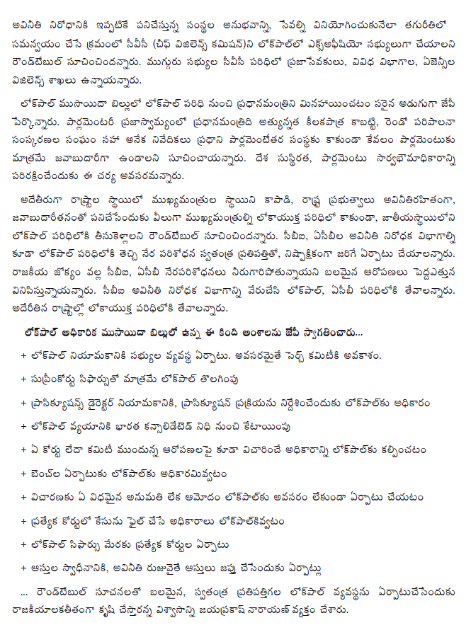 The Lokpal Bill rightly focuses on corruption at the top but ignores corruption at the State and district levels where its incidence is most. The Lok Satta Party therefore wants the Union Government to incorporate creation of Lokayutkas in States and ombudsmen in districts in the Lokpal Bill.