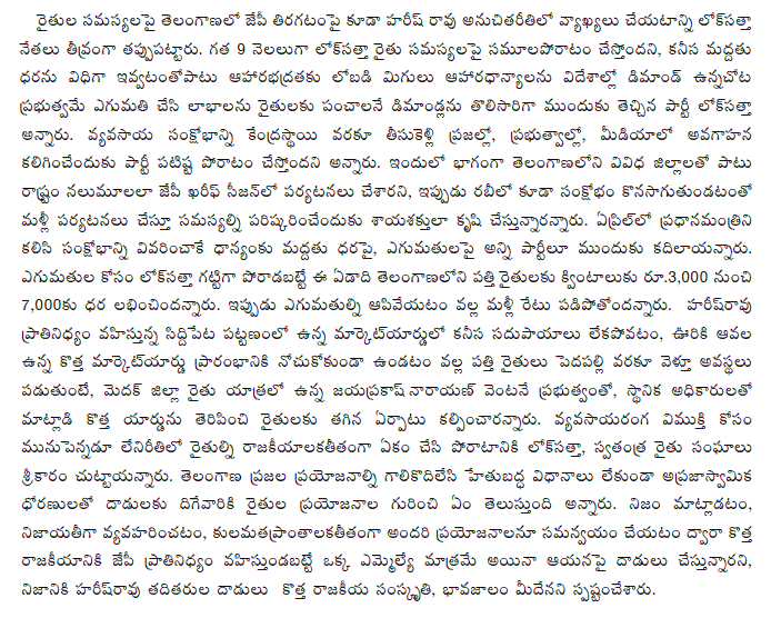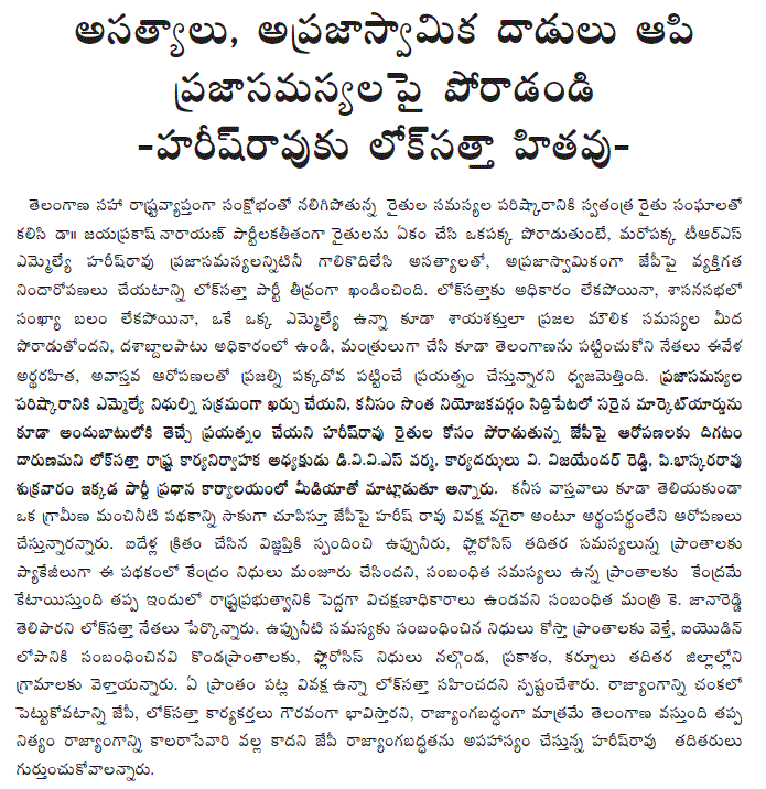 According to media reports, Mr. Harisha Rao faulted Dr. JP for being ‘silent on the State Government ‘diverting Central funds under a drinking water scheme entirely to Coastal Andhra’ and for touring Telangana districts in the cause of farmers.