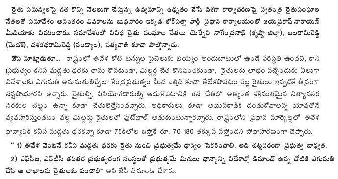 Dr. JP recalled that despite repeated representations to all those in power from the Prime Minister downwards for the last seven months, precious little has been done to rescue the farmer from the miserable plight he finds himself in. The real price of food grains is actually falling, whereas general inflation is 9% in the country. The minimum support price (MSP) of paddy is Rs.1030 per quintal, and this barely meets the costs of cultivation of owner-farmers, and with MSP tenants incur cash losses. The crisis in the farm sector has now accentuated with the farmer not getting even the MSP for paddy anywhere in Andhra Pradesh.