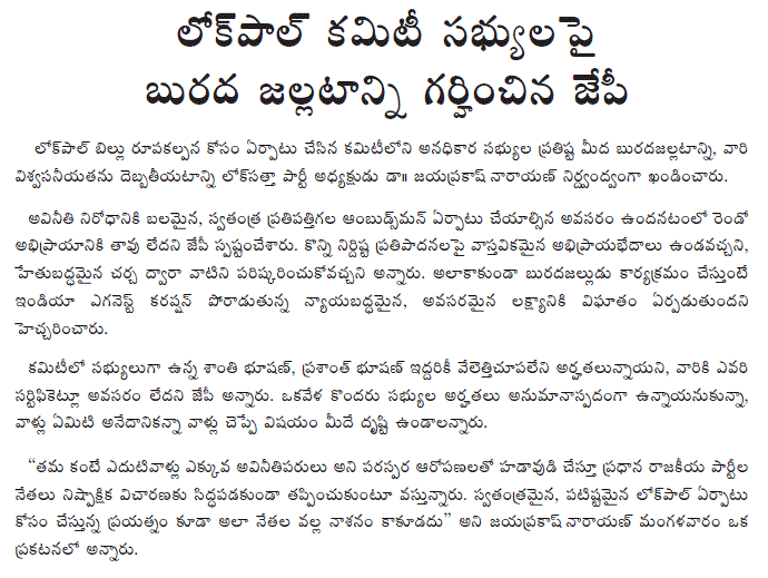 In a media statement, Dr. JP said there could be no two opinions on the need for a robust and independent Ombudsman to eradicate corruption. There can be genuine differences of opinion on specific proposals calling for reasoned debate for resolving them. Mudslinging will merely derail the just and worthy cause for which India against Corruption is fighting.