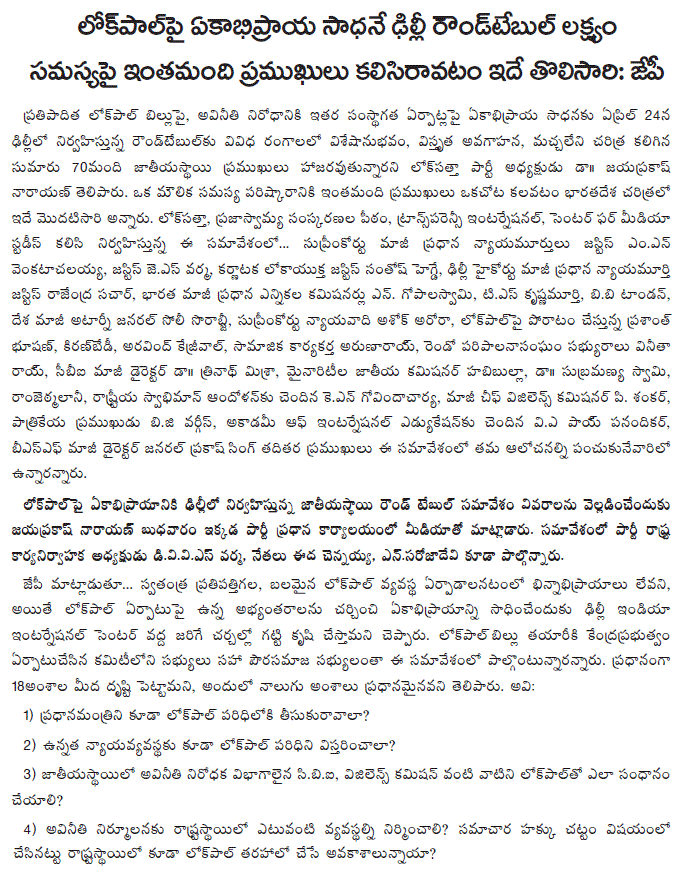 Addressing a media conference, Lok Satta Party President Dr. Jayaprakash Narayan said here today that the day-long deliberations at the India International Center would grapple with contentious issues and strive to arrive at a consensus. Significantly, all the civil society members included in the committee appointed by the Union Government to draft the Lok Pal Bill will be taking part in the Round Table.