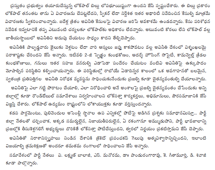 Announcing this at a media conference here today, Lok Satta Party President Dr. Jayaprakash Narayan expressed his whole-hearted support to social activist Anna Hazare’s crusade against corruption. He, however, appealed to Mr. Anna Hazare to call off his indefinite fast demanding adoption of a People’s Lok Pal Bill and wanted the Government to give a categorical assurance that it would consult all stakeholders before it finalized the Bill.