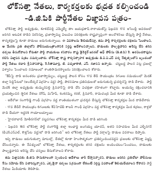 The following is the text of representation that Lok Satta team led by Party Working President DVVS Varma submitted to DGP, seeking security cover to Lok Satta Party leaders and activists, immediately arresting all the culprits involved in the widespread attacks and pursuing necessary course of action...