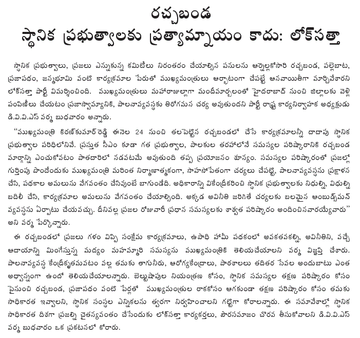 In a media statement, Lok Satta Party President D. V. V. S. Varma pointed out that Chief Minister N. Kiran Kuma Reddy was merely replicating what his predecessors did by launching a ‘rachchabanda’ program from January 24. A Chief Minister eager to earn people’s recognition by resolving their problems fast ought to have embarked on cleansing the administration and devolved powers, responsibilities and resources on elected local governments, and opted for an ombudsmen system to prevent and mitigate corruption.