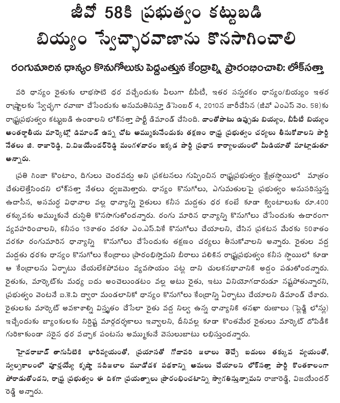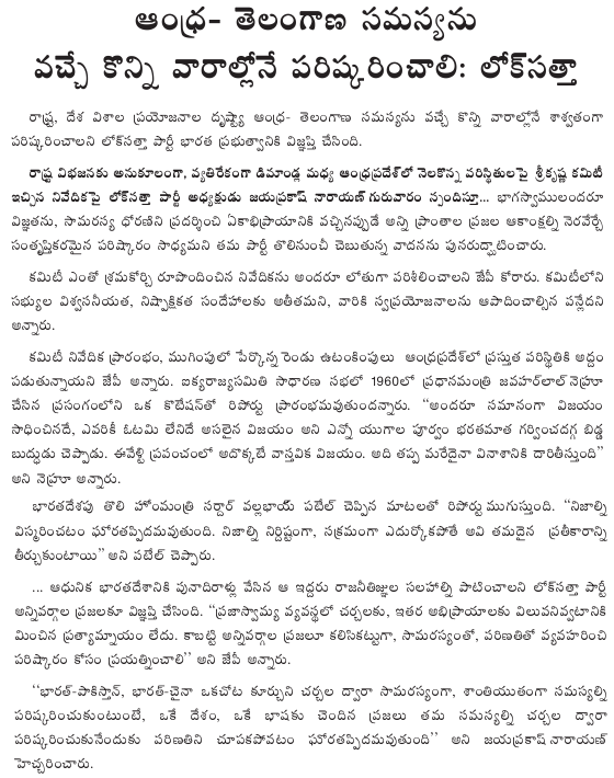 Commenting on the Srikrishna Committee report on the situation prevailing in Andhra Pradesh in the context of the demand for and against bifurcation of the State, Lok Satta Party President Dr. Jayaprakash Narayan reiterated the party’s view that a satisfactory solution that addresses the aspirations of people of all regions is possible if all the concerned display a sense of accommodation and good sense and arrive at a consensus.