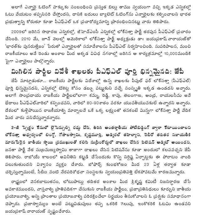 PFL canvassed in favor of the Lok Satta Party during general elections and elections to the Greater Hyderabad Municipal Corporation.