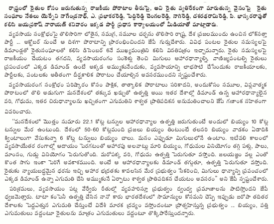 The Lok Satta Party suggested that all parties unite transcending their differences to get both short-term and long-term problems of farmers resolved.