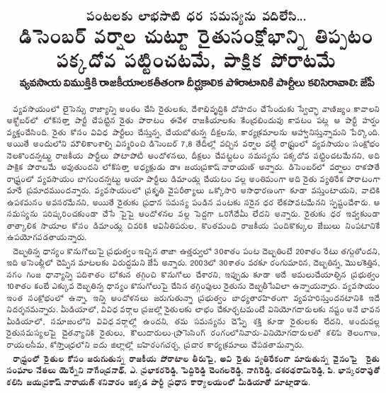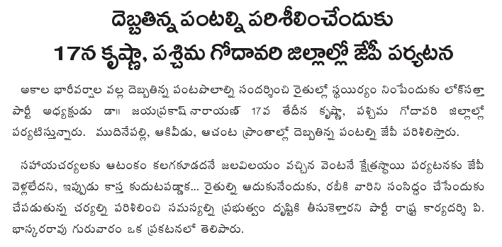 Lok Satta Party President Dr. Jayaprakash Narayan is visiting Krishna and West Godavari districts on Friday, December 17, to boost the morale of farmers who have suffered heavy crop losses in the wake of heavy and unusual rains during the current kharif. Dr. JP will be visiting Mudinepalli, Akiveedu, and Achanta areas.