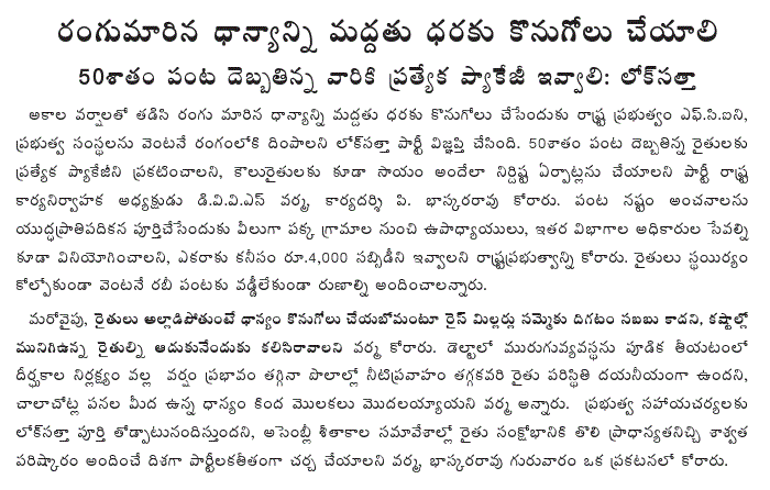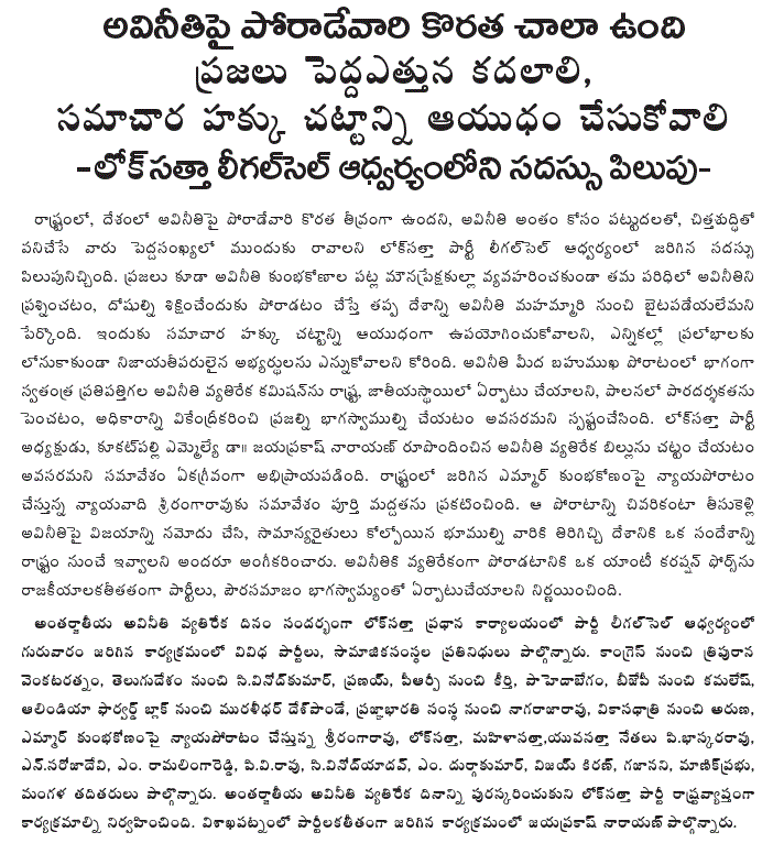Initiating the debate, Legal Cell Convener C. V. L. Narasimha Rao said that failure to discharge one’s duty as a Government employee too was a corrupt practice. Corruption did not mean mere acceptance of a bribe. Mrs. T. Venkataratnam said that corruption had become vicious as politicians who spent crores of rupees in elections enriched themselves many times more once elected. Ms. Keerti and Shaheeda Begum expressed their shock over the 2-G spectrum scam, while Mr. Deshpande said parties should fight against corruption jointly. Mr. Bhaskara Rao said that people had become helpless as politicians, officials and judges had all become corrupt one after another over the years. He underlined the need for institutional mechanisms and people’s participation to mitigate corruption. Advocate Ranga Rao disclosed that he had obtained 650 documents under the Right to Information Act before launching his battle against the Emaar scandal. Ms. Aruna suggested implementation of citizen charters as a means of curbing corruption while Mrs. N. Sarojadevi recalled Lok Satta’s campaign against the 2-G spectrum.