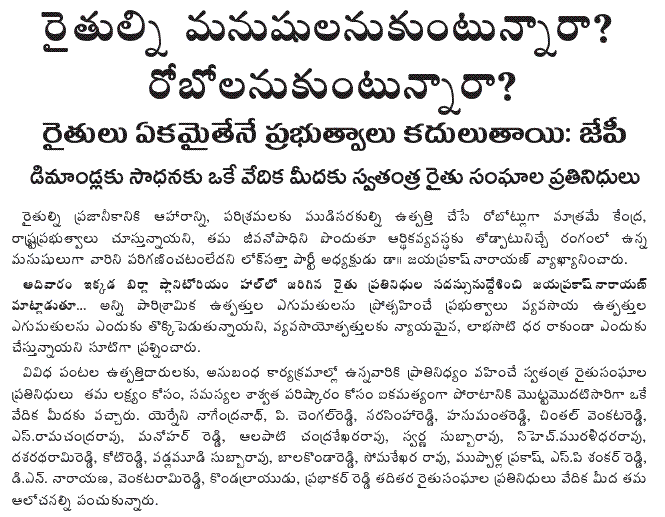 Dr. JP said that no Government in Andhra Pradesh would dare ignore farmers if they stood united. There are 1.2 crore farmers and 60 lakh tenants in Andhra Pradesh accounting for at least 7.2 crore people, of whom 3.6 crore are voters. Which party or Government could take them for granted if they joined hands, defying politicians’ attempts at splitting them on caste or party lines?