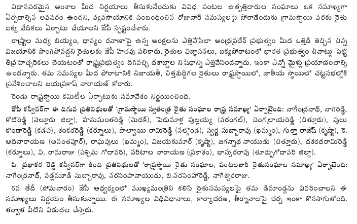 A Federation of village level Independent Farmers’ State Associations with Dr.JP as convenor and the following as members is constituted: Nagendranath, Nagi Reddy, Koti Reddy (Nellore), Hanumantha Reddy (Medak), Perumalla Pullaiah (Warangal), Chengalraya Reddy (Chittoor), Pulu Konda Reddy (Kadapa), Sankara Reddy ( Kurnool), Palvai Rami Reddy (Nalgonda), Swarna Subba Rao (Khammam), Gutha Rajesh (Krishna), K. Adinarayana (Ananthapur), Raghavulu (Khammam), Vijaya Kumar (Krishna), Jagannatha Naidu (Chittor), Dasaratha Rami Reddy (Kurnool), V. Rama Raju (West Godavari), Paritala Narayana (Prakasam), Bhaskara Rao (East Godavari dist).