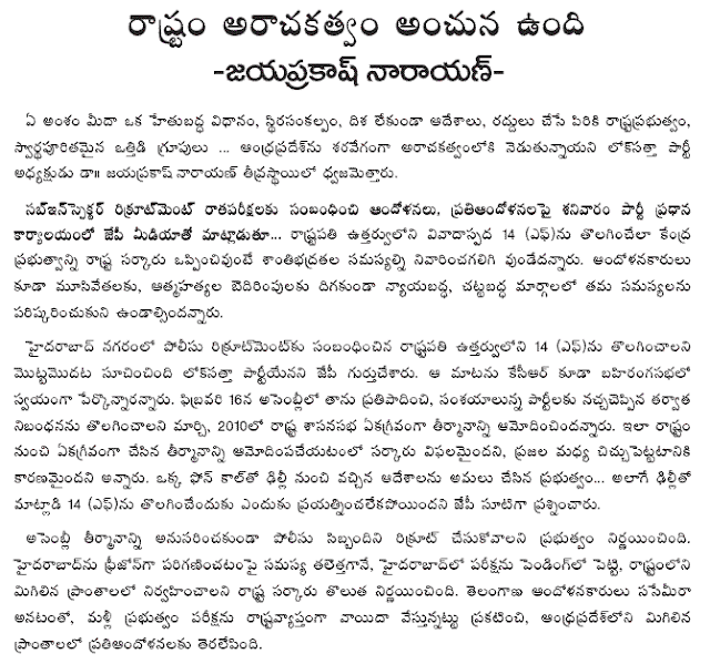 Dr. JP recalled that the Lok Satta Party was the first to suggest deletion of the clause 14 F of the Presidential Order relating to recruitment of police in Hyderabad city. The State legislature unanimously adopted a resolution seeking deletion as early as in March 2010.