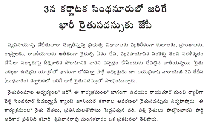In a media statement, Dr. JP said that the Karnataka Government had offered a bonus of Rs.100 a quintal within 24 hours of Karnataka paddy growers drawing the Government’s attention to their plight by organizing a largely attended conference at Sindanur in Raichur district of Karnataka on November 3.