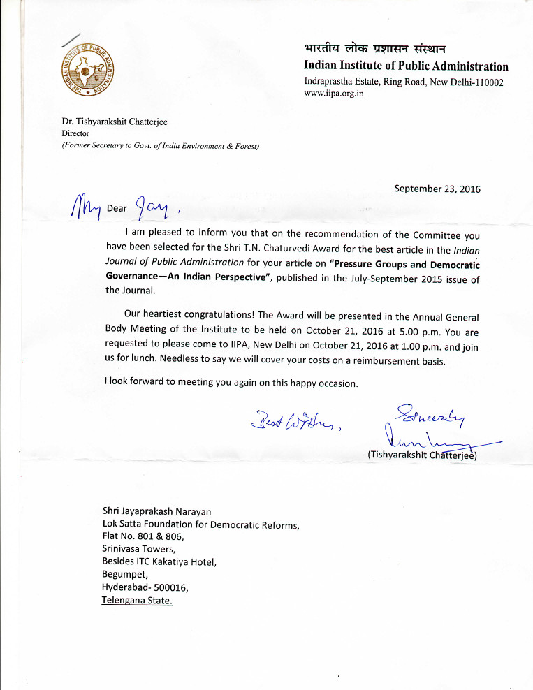 Foundation for Democratic Reforms and Lok Satta movement have been working on Citizen's Charters and a service guarantee law for several years. We have also had detailed interaction with the Parliamentary Committee on the subject. At the instance of the Parliamentary Committee, we have prepared a draft Bill integrating normal service delivery with electronic services. In this age of increasing computerization, it is vital that we integrate all forms of services and ensure a single, effective, enforceable law to improve most services to ordinary people and ensure convergence of services to facilitate easy access.