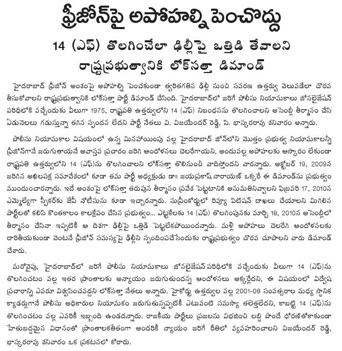 The Lok Satta Party today asked the State Government to ensure that Section 14 (f) of the Presidential Order, 1975 is deleted as unanimously sought by the Andhra Pradesh Assembly on March 18, 2010. Deletion of the section will bring appointment of police personnel up to a certain cadre under the zonalization scheme introduced through the 32nd Constitution Amendment Act of 1975.