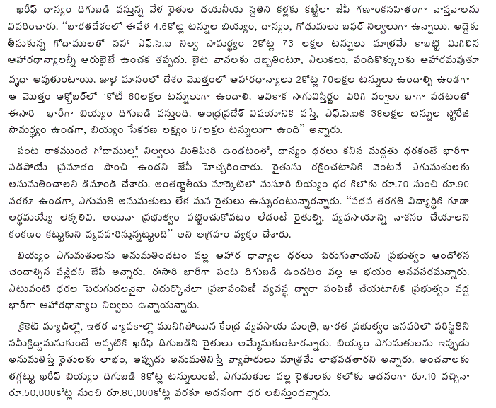 Dr. JP said that the Union Government proposed review in January would not help the farmer as he will have already sold away his kharif production. If at all it permits rice exports then, it is only traders who benefit. If the kharif rice output turns out to be 80 million tons as estimated, a Rs.10 per kg higher price to the farmer because of exports translates into tens of thousands of crores of higher returns to farmers.
