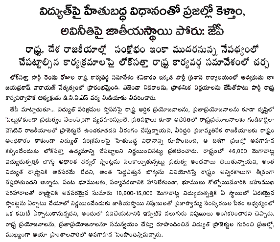 Dr. JP said that the Foundation for Democratic Reforms would soon constitute a committee of national experts to hammer out an electricity policy that would safeguard the interests of both the State and the people. The committee would decide what sort of power plants should be set up to meet the State’s requirement of 10,000 mw- 15,000 mw. The plants should not harm either croplands or the environment. The policy should provide for multi-pronged compensation to families displaced by power plants.