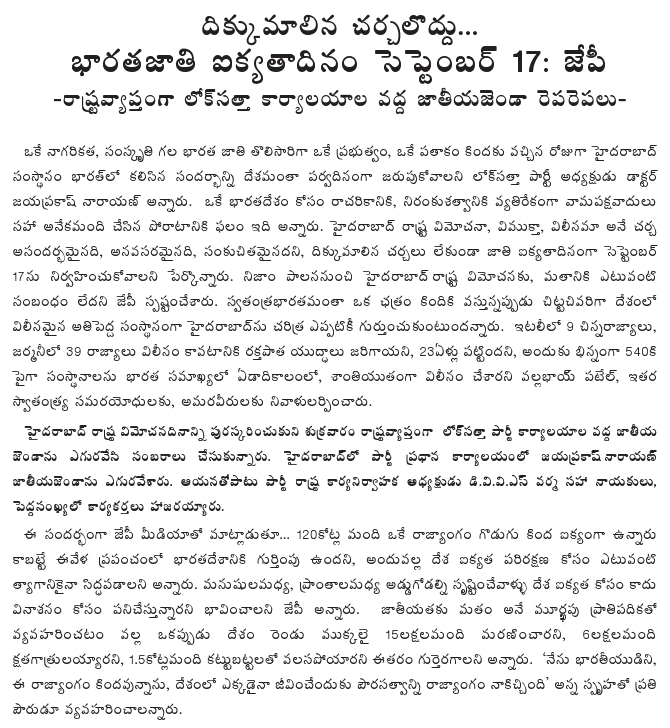 Dr. JP said that there forces in the country which are out to disrupt the unity of the country in the name of region, religion, caste and language to serve their partisan end of coming to power at any cost. Power and positions have become means for looting the public and not for serving them. It is, therefore, unfortunate that the integrity of the highest judiciary has come under a shadow even as Hyderabad lawyers, who are supposed to preserve and protect the Constitution have resorted to unprofessional conduct by resorting to violence.