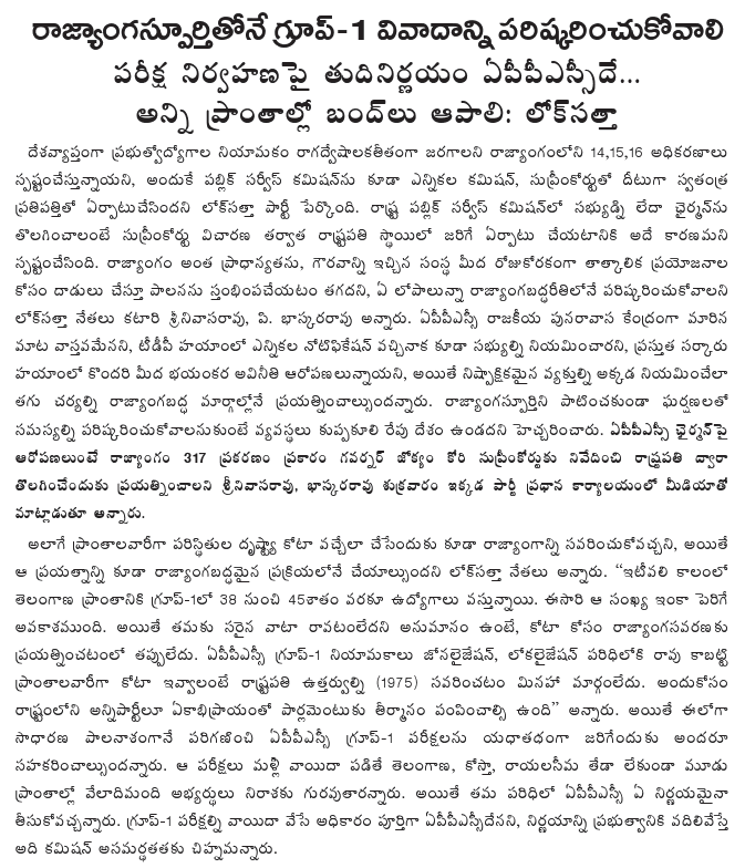 On the demand from certain sections for reservation of 42 percent of Group I posts for people from the Telangana region, the Lok Satta leaders said they could not be faulted for voicing the demand but they should realize that they should achieve their objective through constitutional means. The Constitution guarantees equality before law and equality of opportunity to every one and expressly prohibits discrimination based on caste, race, religion, language, gender, place of birth and residence. At the same time, it provides for making laws prescribing requirements of residence for public employment.